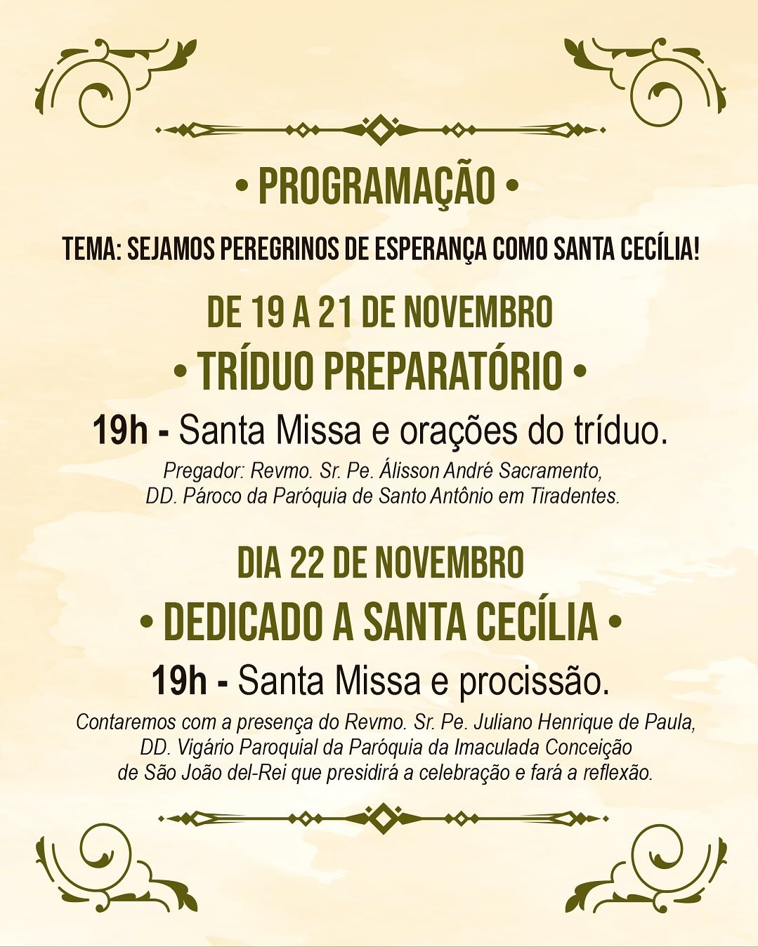 No sábado, 22, haverá Missa festiva e procissão. Neste ano a festa tem como tema “Sejamos peregrinos de esperança como Santa Cecília”.