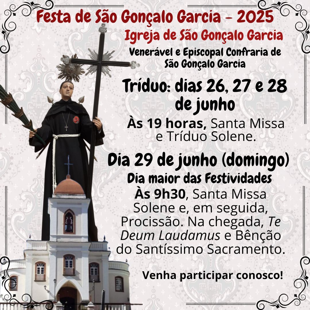 Tem início nesta quinta-feira, 26, na Paróquia São Francisco de Assis, a festa em honra a São Gonçalo Garcia. Celebrações de missa, orações do tríduo e procissão marcam a programação festiva. Até o sábado, dia 28, haverá Santa Missa e Tríduo Solene às 19 horas. Já no domingo, dia 29, dia maior da festa, às 9:30 horas, vai acontecer a celebração da Missa Solene, seguida de procissão, Te Deum Laudamus e Bênção do Santíssimo Sacramento.
