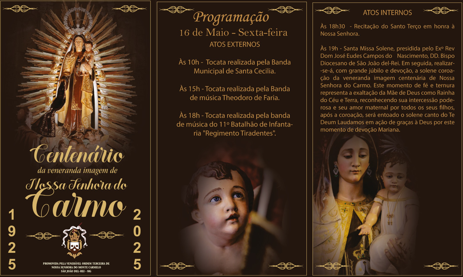 A Venerável Ordem Terceira de Nossa Senhora do Carmo, em São João del-Rei, celebra nesta sexta-feira, 16 de maio, o centenário da imagem de Nossa Senhora. Venerada no retábulo da bela capela mor, dentro do trono, a imagem foi esculpida em Portugal e abençoada solenemente no dia 1º de maio de 1925, por Dom Helvécio Gomes de Oliveira, Arcebispo de Mariana.