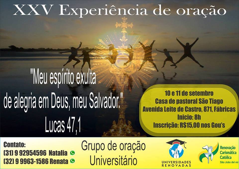 Com o objetivo de levar os jovens universitários a conhecer Jesus, fazendo uma experiência com o Amor de Deus o Ministério Universidades Renovadas de São João del Rei (MUR-SJDR) promove nos dias 10 e 11 de setembro o XXV Experiência de Oração. O tema deste ano será “Meu espírito exulta de alegria, em Deus meu Salvador”(Lc 47,1).